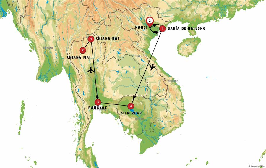 Vuelos incluidos: Hanói - Siem Reap, em classe econômica e traslado de / para o aeroporto, Bangkok - Chiang Rai em classe econômica e traslado de / para o aeroporto