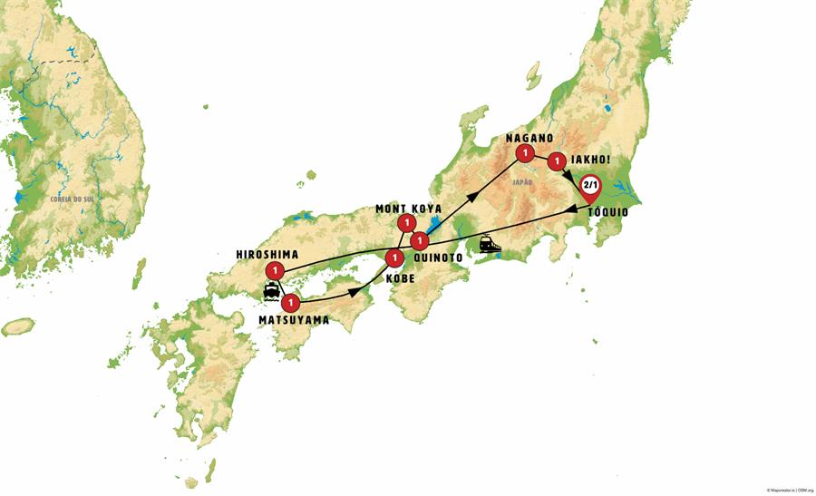 Entradas: Metrô, Templo Zojoji, Templo Meiji, Templo Sensoji, Tokyo Skytree (até o mirante Tembo Deck), Museu Memorial da Paz em Hiroshima , Dogo Onsen, Templo Ishiteji , Santuário sintoísta , Jardins Ritsurin , Ponte de Naruto , Museu Memorial do Terremoto , Mausoléu de Okuno, Templo de Kongobu-ji e Ajikan ou Zazen meditaão no Monte Koya , Santuário Fushimi Inari, Palácio Imperial, Templo de Kinkaku-ji , Castelo do Matsumoto , Templo Zenko-ji, Cerimônia do Gomakuyo, Parque dos Macacos em Jigokudani em Nagano , Templo Toshogu, Mausoléu Taiyuinbyo em Nikko.