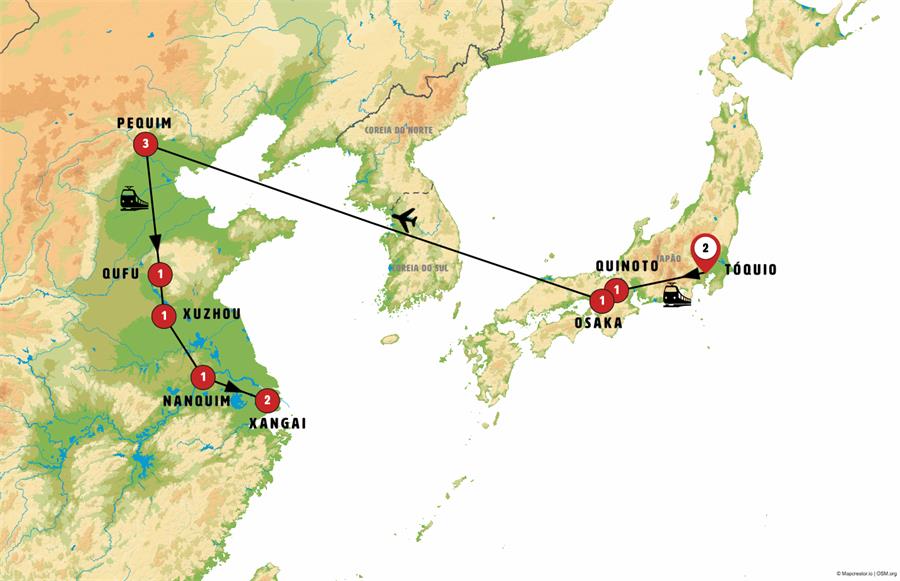 Entradas: Metrô, Templo Zojoji, Templo Meiji, Templo Sensoji, Tokyo Skytree (até o mirante Tembo Deck), Fushimi Inari, Palacio Imperial, Templo de Kinkakuji , Templo de Todai-ji e Templo de Horyu-ji , Cidade Proibida, Parque Jingshan, Palácio de Verão , Grande Muralha China Mutianyu, Templo do Céu, massagem dos pes, aula de Tai Chi , Templo Dai , Mansão e Templo de Confúcio , Mausoléu subterráneo do imperador da dinastia Han , Mausoléu de Sun Yatsen e Templo Lingu , Jardim do Humilde administrador , Jardim Yuyuan, demostracão da Cerimônia do Chá