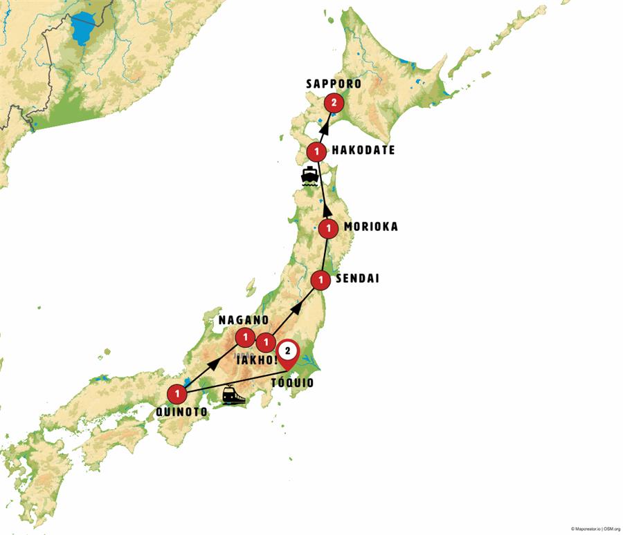 tokio, Kyoto, Tsumago, Matsumoto, Nagano, parque de los monos, kusatsu, ikaho , Nikko, Sendai, matshushima, hiraizumi , Morioka, Hirosaki, Aomori, Hakodate, onuma, Noboribetsu, Sapporo.