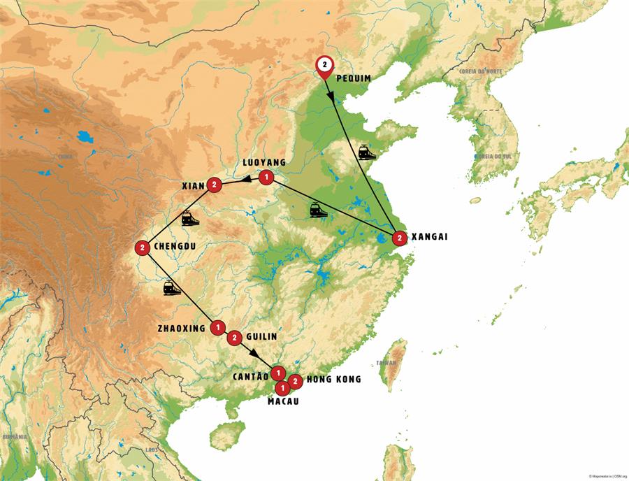 Beijing, Shanghai, Luoyang, longmen , sanmexia, Xian, Chengdu, pueblo miao, zhaoxing, guangxiao, chengyang, longsheng, Guilin, crucero por el rio li, yangshuo, huangyao, canton, Zhuhai, Macau, Hong Kong.