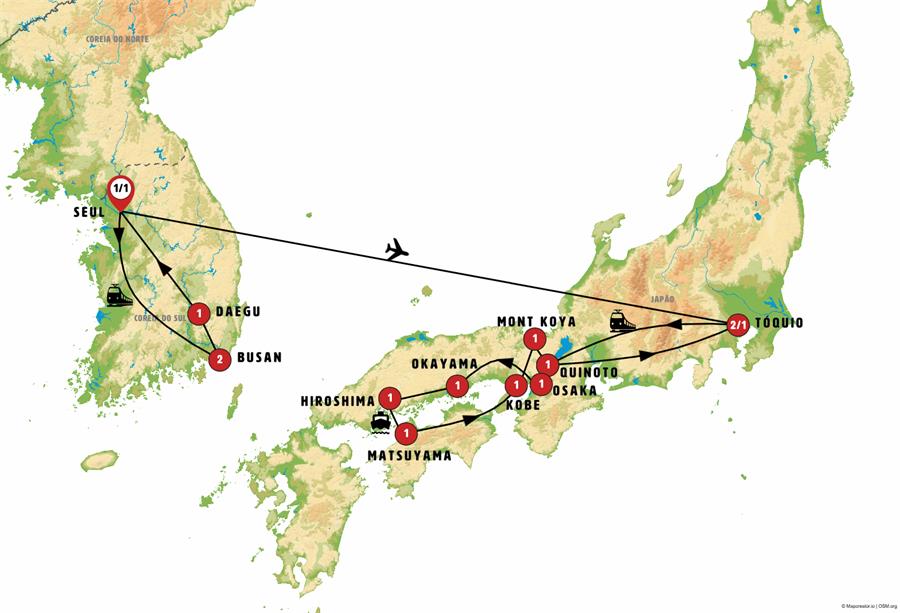 Entradas: Palácio Changdeokgung, Bukchon Hanok Village, Memorial da Guerra de Coreia, Templo de Haedong Yongung, Memorial das Nações Unidas , Aldeia Cultural de Gamcheon , Grota Budista de Seokguram , Templo de Bulguksa , Parque dos Túmulos, Observatório Astronômico Cheomsongdae , Museu de Medicina Tradicional de Yangnyeongsi , Museu das Máscaras do Mundo e tradicional Vila de Hahoe Village, Escola Confucionista de Byeongsan Seowon , Metrô, Templo Zojoji, Templo Meiji, Templo Sensoji, Tokyo Skytree (até o mirante Tembo Deck) , Fushimi Inari, Palacio Imperial, Templo de Kinkakuji , Templo de Todai-ji e Templo de Horyu-ji , Castelo , Korakuen Garden , Templo Itsukushima , Museu Memorial da Paz em Hiroshima , Dogo Onsen, Templo Ishiteji , Santuário sintoísta , Jardins Ritsurin , Ponte de Naruto , Museu Memorial do Terremoto , Mausoléu de Okuno, Templo de Kongobu-ji e Ajikan ou Zazen meditaão no Monte Koya , Santuário Fushimi Inari, Palácio Imperial, Templo de Kinkaku-ji , Castelo do Matsumoto
