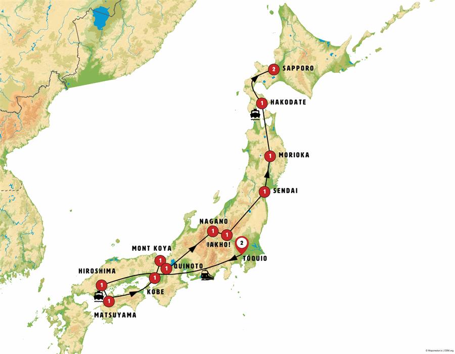 tokio, Hiroshima, Matsuyama, Kotohira, Takamatsu, Naruto, Kobe, Osaka, monte koya, Kyoto, Tsumago, Matsumoto, Nagano, parque de los monos, kusatsu, ikaho , Nikko, Sendai, matshushima, hiraizumi , Morioka, Hirosaki, Aomori, Hakodate, onuma, Noboribetsu, Sapporo.