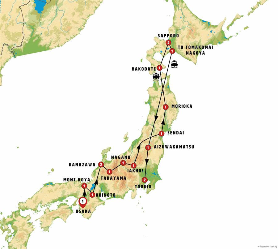 Osaka, monte koya, Kyoto, eihei-ji, katsuyama-museo de los dinosaurios, katsuyama, Kanazawa, ainokura, Shirakawago, aldea de hida, Takayama, hida furukawa, Matsumoto, Nagano, parque de los monos, kusatsu, ikaho , Nikko, Sendai, matshushima, hiraizumi , Morioka, Hirosaki, Aomori, Hakodate, onuma, Noboribetsu, Sapporo, toyako onsen, monte usu, ferri tomakomai sendai, yamadera , Aizuwakamatsu, ouchijuku, tokio.