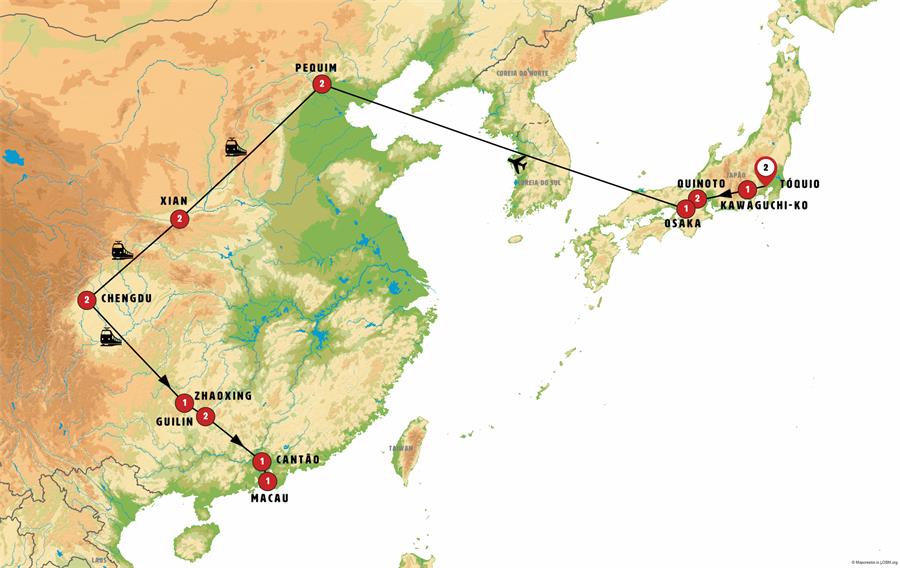 Entradas: Metrô, Templo Zojoji, Templo Meiji, Templo Sensoji, Tokyo Skytree (até o mirante Tembo Deck), Arakurayama Sengen Park , Santuário Fuji Sengen , Vilarejo Museu , Museu Toyota , Templo de Tenryu-ji, Bosque de Bambu de Arashiyama, Santuário Fushimi Inari, Palácio Imperial, Templo de Kinkaku-ji , Templo de Todai-ji e Templo de Horyu-ji , Cidade Proibida, Parque Jingshan, Palácio de Verão , Grande Muralha China Mutianyu , Museu do Exercito de Terracota, pequena pagode do ganso e breve espetáculo de instrumentos tradicionais na Torre do Tambor (nem sempre garantido) , Sistema de irrigacão em Dujiangyan, Montanha sagrada de Quingcheng Shan , Aldeia Basha Miao , Vilarejo Zhaoxing da etnia Dong , Vilarejo Guangxiao da etnia Dong , Ponte do vento , Arrozeiras , Gruta das Flautas de Cana , Cidade antiga , Casa do clã Chen