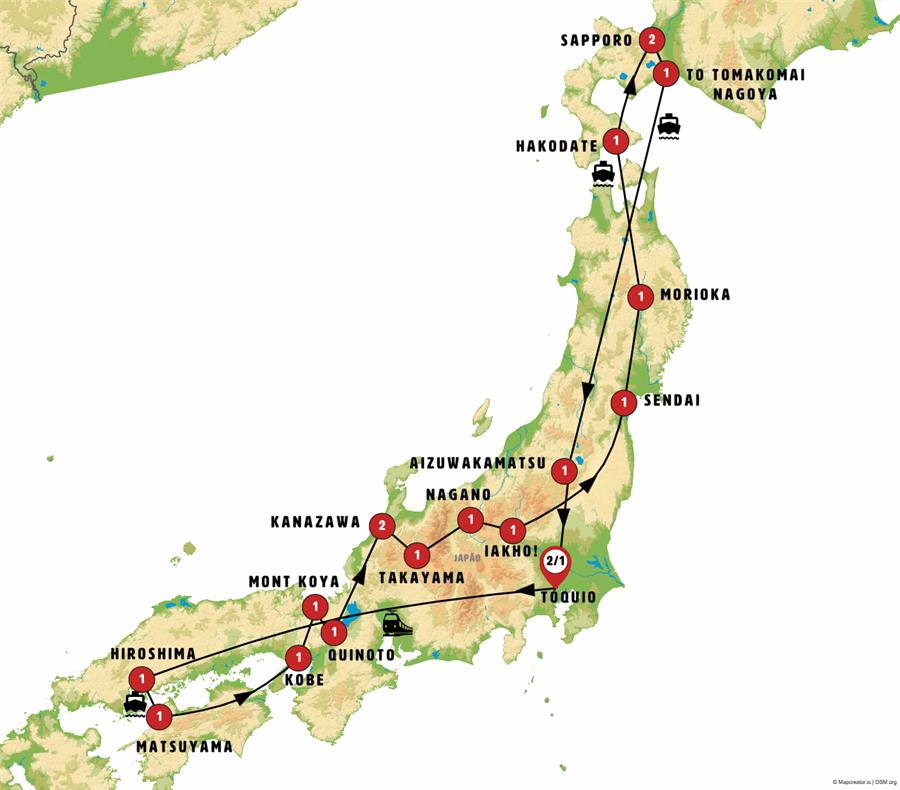 tokio, Hiroshima, Matsuyama, Kotohira, Takamatsu, Naruto, Kobe, Osaka, monte koya, Kyoto, eihei-ji, katsuyama-museo de los dinosaurios, katsuyama, Kanazawa, ainokura, Shirakawago, aldea de hida, Takayama, hida furukawa, Matsumoto, Nagano, parque de los monos, kusatsu, ikaho , Nikko, Sendai, matshushima, hiraizumi , Morioka, Hirosaki, Aomori, Hakodate, onuma, Noboribetsu, Sapporo, toyako onsen, monte usu, ferri tomakomai sendai, yamadera , Aizuwakamatsu, ouchijuku.