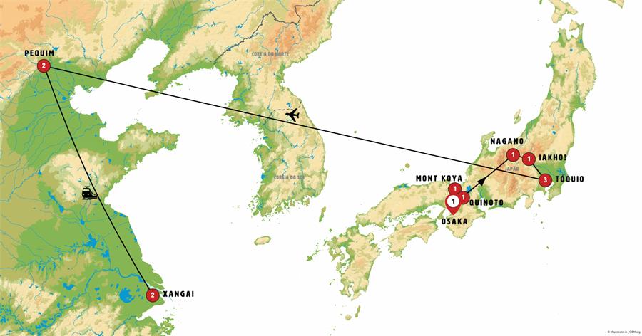 Entradas: Mausoléu de Okuno, Templo de Kongobu-ji e Ajikan ou Zazen meditaão no Monte Koya, Santuário Fushimi Inari, Palácio Imperial, Templo de Kinkaku-ji , Castelo do Matsumoto , Templo Zenko-ji, Cerimônia do Gomakuyo, Parque dos Macacos em Jigokudani em Nagano , Templo Toshogu, Mausoléu Taiyuinbyo em Nikko. , Metrô, Templo Zojoji, Templo Meiji, Templo Sensoji, Tokyo Skytree (até o mirante Tembo Deck) , Arakurayama Sengen Park , Santuário Fuji Sengen , Cidade Proibida, Parque Jingshan, Palácio de Verão , Grande Muralha China Mutianyu , Jardim Yuyuan, demostracão da Cerimônia do Chá