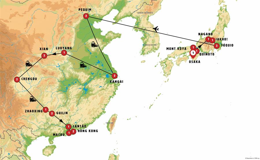 Osaka, monte koya, Kyoto, Tsumago, Matsumoto, Nagano, parque de los monos, kusatsu, ikaho , Nikko, tokio, monte fuji, kawaguchiko, Beijing, Shanghai, Luoyang, longmen , sanmexia, Xian, Chengdu, pueblo miao, zhaoxing, guangxiao, chengyang, longsheng, Guilin, crucero por el rio li, yangshuo, huangyao, canton, Zhuhai, Macau, Hong Kong.