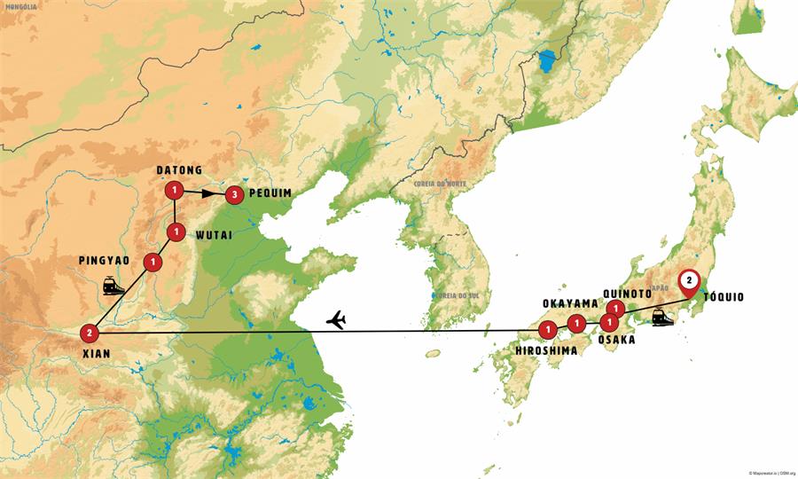 tokio, Kyoto, Nara, Osaka, Himeji, jardines de korakuen, Okayama, Kurashiki, itsukushima, Hiroshima, Xian, lingfen, mansion clan wang , Pingyao, wutai , yanmenguan , yingxian, templo colgante, Datong, jiming post, Beijing.