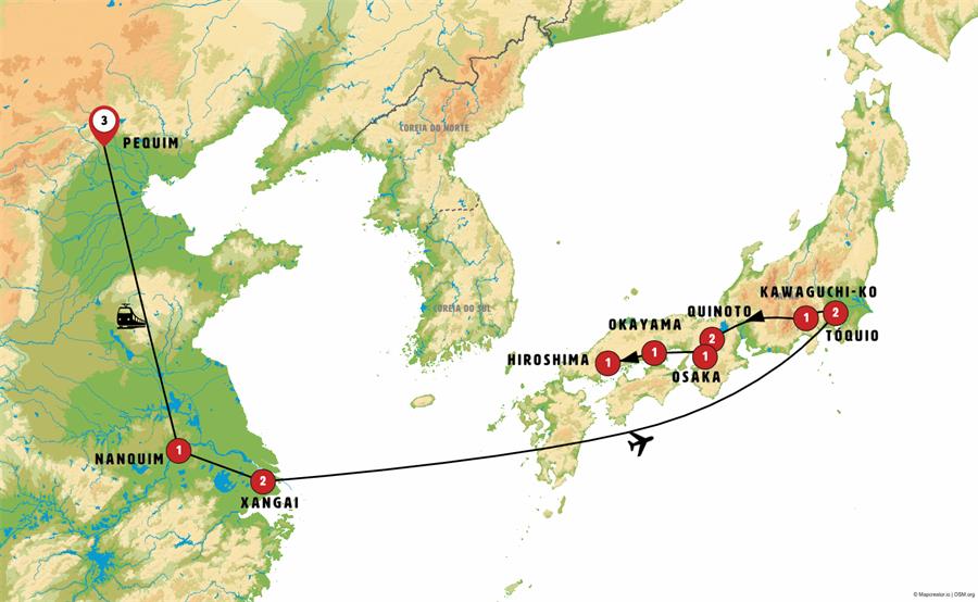Entradas: Grande Muralha China Mutianyu, Templo do Céu, massagem dos pes, aula de Tai Chi, Cidade Proibida, Parque Jingshan, Palácio de Verão , Mausoleu de Sun Yatsen e Templo Lingu , Jardim do Humilde administrador , Jardim Yuyuan, demostracão da Cerimônia do Chá , Metrô, Templo Zojoji, Templo Meiji, Templo Sensoji, Tokyo Skytree (até o mirante Tembo Deck) , Arakurayama Sengen Park , Santuário Fuji Sengen , Vilarejo Museu , Museu Toyota , Templo de Tenryu-ji, Bosque de Bambu de Arashiyama, Santuário Fushimi Inari, Palácio Imperial, Templo de Kinkaku-ji , Templo de Todai-ji e Templo de Horyu-ji , Castelo , Korakuen Garden , Templo Itsukushima , Museu Memorial da Paz em Hiroshima