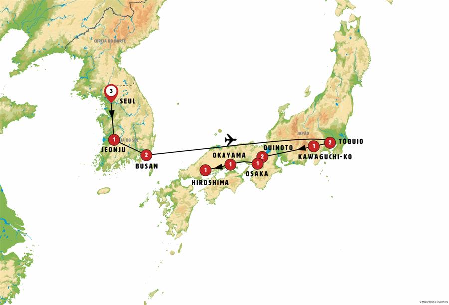 Seul, Suwon, Jeonju, damyang, haeinsa , Busan, tokio, monte fuji, kawaguchiko, iyashi no sato nemba, Toyota, Kyoto, Nara, Osaka, Himeji, jardines de korakuen, Okayama, Kurashiki, itsukushima, Hiroshima.