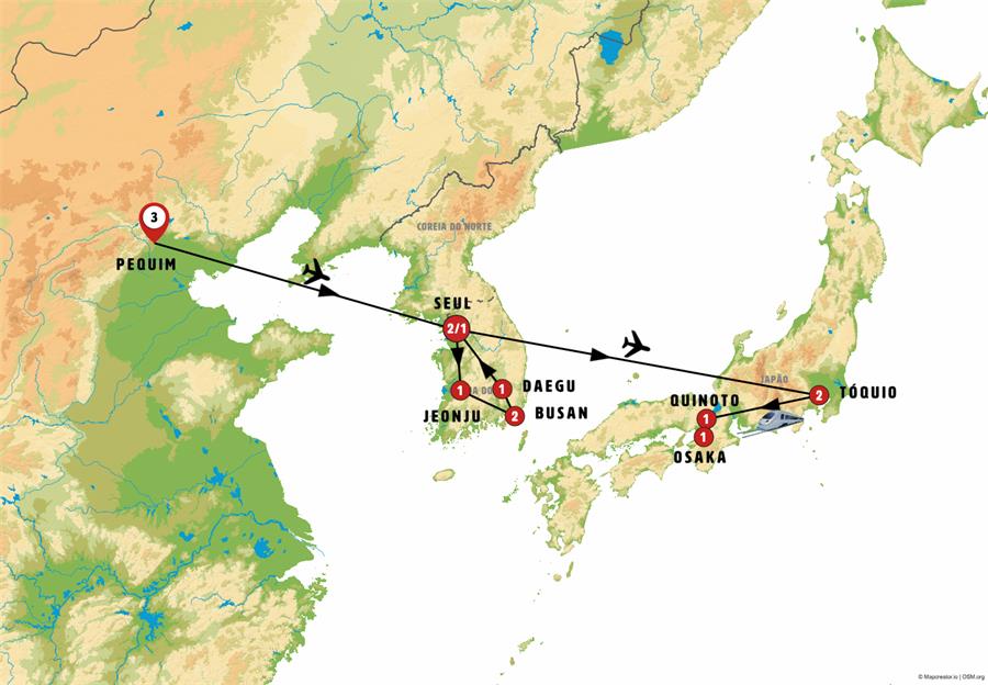 Entradas: Cidade Proibida, Parque Jingshan, Palácio de Verão, Grande Muralha China Mutianyu, Templo do Céu, massagem dos pes, aula de Tai Chi , Palácio Changdeokgung, Bukchon Hanok Village, Memorial da Guerra de Coreia , Palácio de Gyeongbokgung , Fortaleza de Suwon, Palácio de verão de Hwaseong Haenggung , Hanok Village , Floresta de Bambu Juknokwon e Museu do Bambu , Templo Budista de Haeinsa , Templo de Haedong Yongung, Memorial das Nações Unidas , Aldeia Cultural de Gamcheon , Grota Budista de Seokguram , Templo de Bulguksa , Parque dos Túmulos, Observatório Astronômico Cheomsongdae , Museu de Medicina Tradicional de Yangnyeongsi , Museu das Máscaras do Mundo e tradicional Vila de Hahoe Village, Escola Confucionista de Byeongsan Seowon , Zona Desmilitarizada de Paju (DMZ Imjingang), Observatório Aegibong em Gimpo e Metrô em Seul , Metrô, Templo Zojoji, Templo Meiji, Templo Sensoji, Tokyo Skytree (até o mirante Tembo Deck) , Fushimi Inari, Palacio Imperial, Templo de Kinkakuji , Templo de Todai-ji e Templo de Horyu-ji