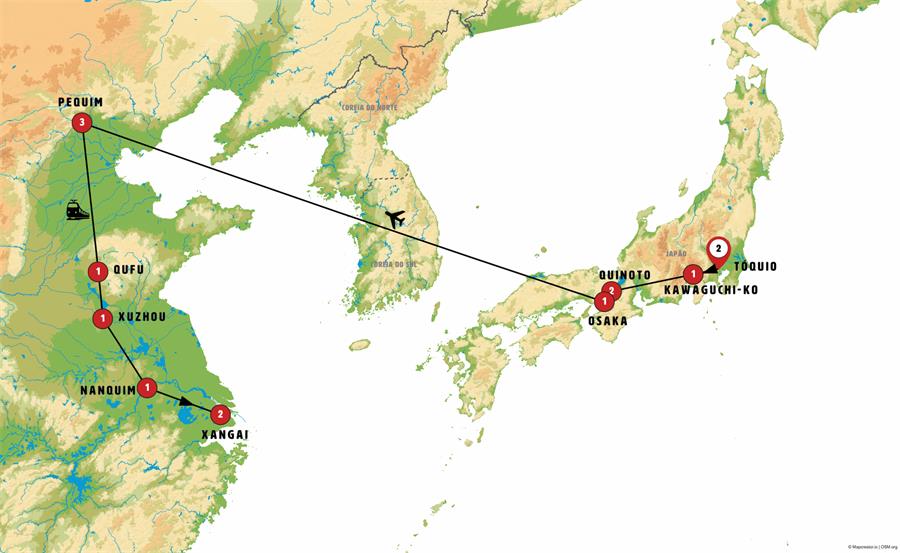 Entradas: Metrô, Templo Zojoji, Templo Meiji, Templo Sensoji, Tokyo Skytree (até o mirante Tembo Deck), Arakurayama Sengen Park , Santuário Fuji Sengen , Vilarejo Museu , Museu Toyota , Templo de Tenryu-ji, Bosque de Bambu de Arashiyama, Santuário Fushimi Inari, Palácio Imperial, Templo de Kinkaku-ji , Templo de Todai-ji e Templo de Horyu-ji , Cidade Proibida, Parque Jingshan, Palácio de Verão , Grande Muralha China Mutianyu, Templo do Céu, massagem dos pes, aula de Tai Chi , Templo Dai , Mansão e Templo de Confúcio , Mausoléu subterráneo do imperador da dinastia Han , Mausoléu de Sun Yatsen e Templo Lingu , Jardim do Humilde administrador , Jardim Yuyuan, demostracão da Cerimônia do Chá
