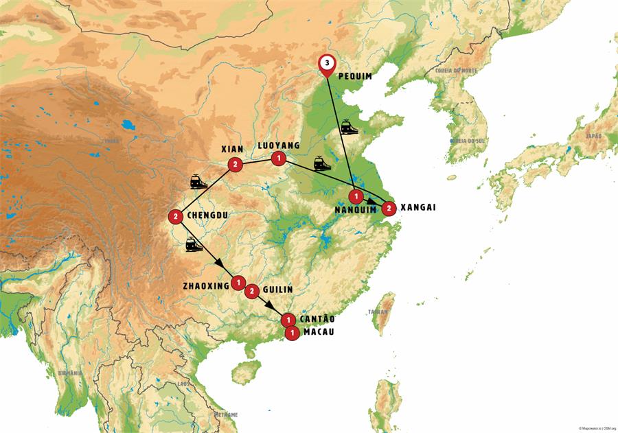 Beijing, Nanjing, Suzhou, Tongli, Shanghai, Luoyang, longmen , sanmexia, Xian, Chengdu, pueblo miao, zhaoxing, guangxiao, chengyang, longsheng, Guilin, crucero por el rio li, yangshuo, huangyao, canton, Zhuhai, Macau.