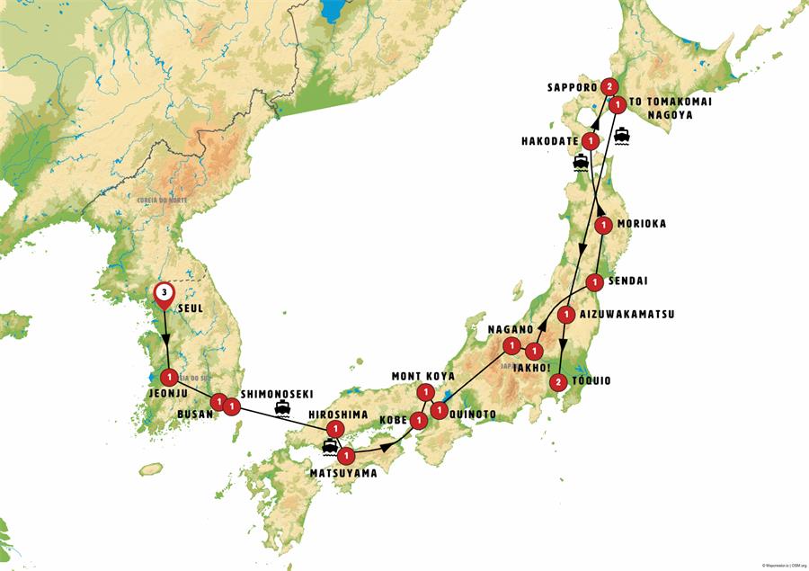 Seul, Suwon, Jeonju, damyang, haeinsa , Busan, Fukuoka, Iwakuni, itsukushima, Hiroshima, Matsuyama, Kotohira, Takamatsu, Naruto, Kobe, Osaka, monte koya, Kyoto, Tsumago, Matsumoto, Nagano, parque de los monos, kusatsu, ikaho , Nikko, Sendai, matshushima, hiraizumi , Morioka, Hirosaki, Aomori, Hakodate, onuma, Noboribetsu, Sapporo, toyako onsen, monte usu, ferri tomakomai sendai, yamadera , Aizuwakamatsu, ouchijuku, tokio.