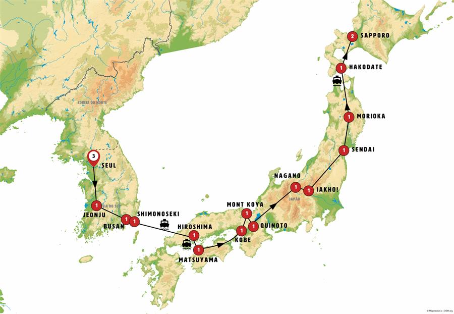 Seul, Suwon, Jeonju, damyang, haeinsa , Busan, Fukuoka, Iwakuni, itsukushima, Hiroshima, Matsuyama, Kotohira, Takamatsu, Naruto, Kobe, Osaka, monte koya, Kyoto, Tsumago, Matsumoto, Nagano, parque de los monos, kusatsu, ikaho , Nikko, Sendai, matshushima, hiraizumi , Morioka, Hirosaki, Aomori, Hakodate, onuma, Noboribetsu, Sapporo.