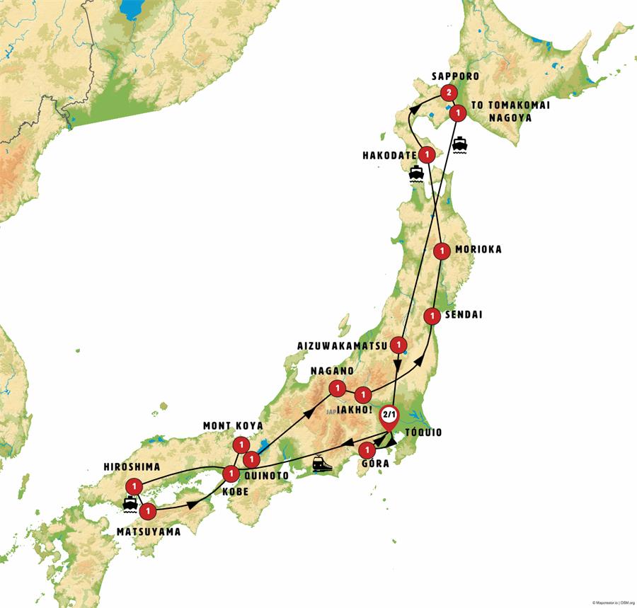 tokio, Hiroshima, Matsuyama, Kotohira, Takamatsu, Naruto, Kobe, Osaka, monte koya, Kyoto, Tsumago, Matsumoto, Nagano, parque de los monos, kusatsu, ikaho , Nikko, Sendai, matshushima, hiraizumi , Morioka, Hirosaki, Aomori, Hakodate, onuma, Noboribetsu, Sapporo, toyako onsen, monte usu, ferri tomakomai sendai, yamadera , Aizuwakamatsu, ouchijuku, Kamakura, enoshima, Odawara, monte fuji, kawaguchiko.