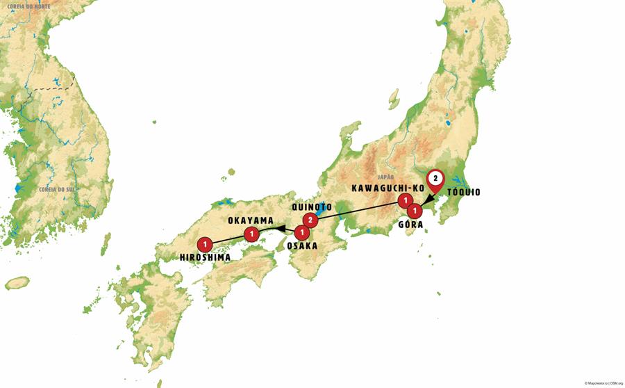 tokio, Kamakura, enoshima, Odawara, monte fuji, kawaguchiko, iyashi no sato nemba, Toyota, Kyoto, Nara, Osaka, Himeji, jardines de korakuen, Okayama, Kurashiki, itsukushima, Hiroshima.