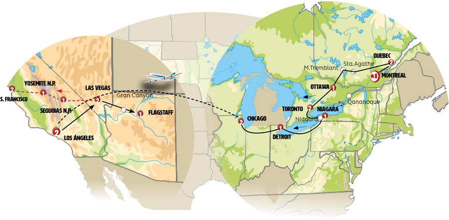 Montreal, Quebec, Sainte-Agathe-des-Monts, Mont Tremblant , Ottawa, Mil Ilhas, Toronto, niagara on the lake, Cataratas do Niagara, Detroit, saugatuck, Chicago, Los Angeles, Las Vegas, cañon del colorado, Flagstaff.