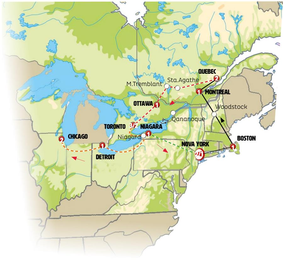 Nova Iorque, Boston, Woodstock, Montreal, Quebec.