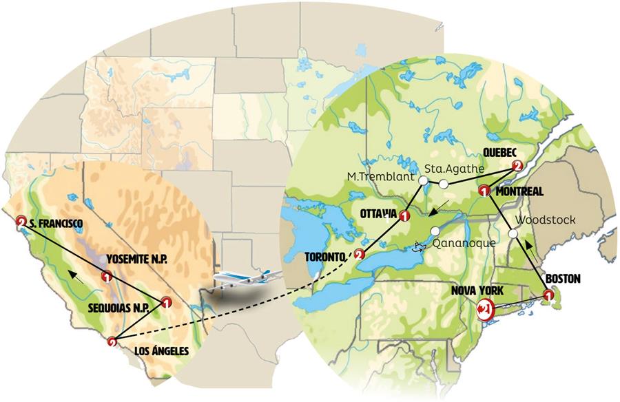 Nova Iorque, Boston, Woodstock, Montreal, Quebec, Sainte-Agathe-des-Monts, Mont Tremblant , Ottawa, Mil Ilhas, Toronto, niagara on the lake, Cataratas do Niagara, Los Angeles, Santa Monica, Solvang, Bakersfield, Parque Nacional da Sequoia, Fresno, Yosemite, San Francisco SFO.