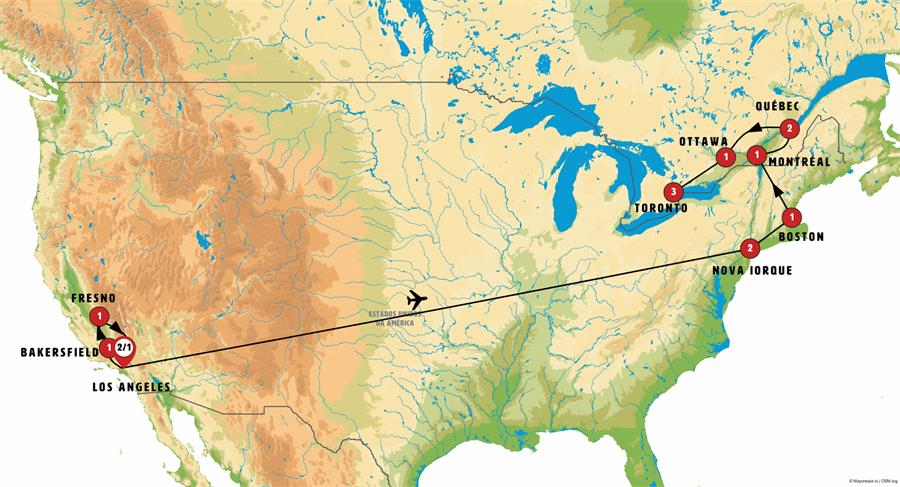 Los Angeles, Santa Monica, Solvang, Bakersfield, Yosemite, Fresno, Parque Nacional da Sequoia, Nova Iorque, Boston, Woodstock, Montreal, Quebec, Sainte-Agathe-des-Monts, Mont Tremblant , Ottawa, Mil Ilhas, Toronto, niagara on the lake, Cataratas do Niagara.