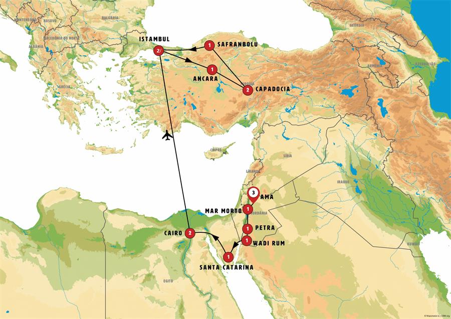 Amã, Jerash, Madaba, betania, Mar Morto, shobak, Petra, Wadi Rum, Aqaba, Eilat, santa catalina, pozo de moises, Cairo, Istambul, Ankara, Capadócia, Safranbolu, gokgol magarasi , eregli.