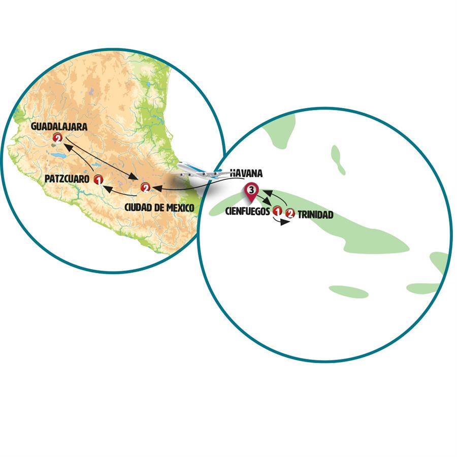 Havana, Guama, punta perdiz, giron, Cienfuegos, Trinidad, Cidade do México, mina de las dos estrellas, tlalpujahua, Pátzcuaro, Morelia, Tlaquepaque, Guadalajara.