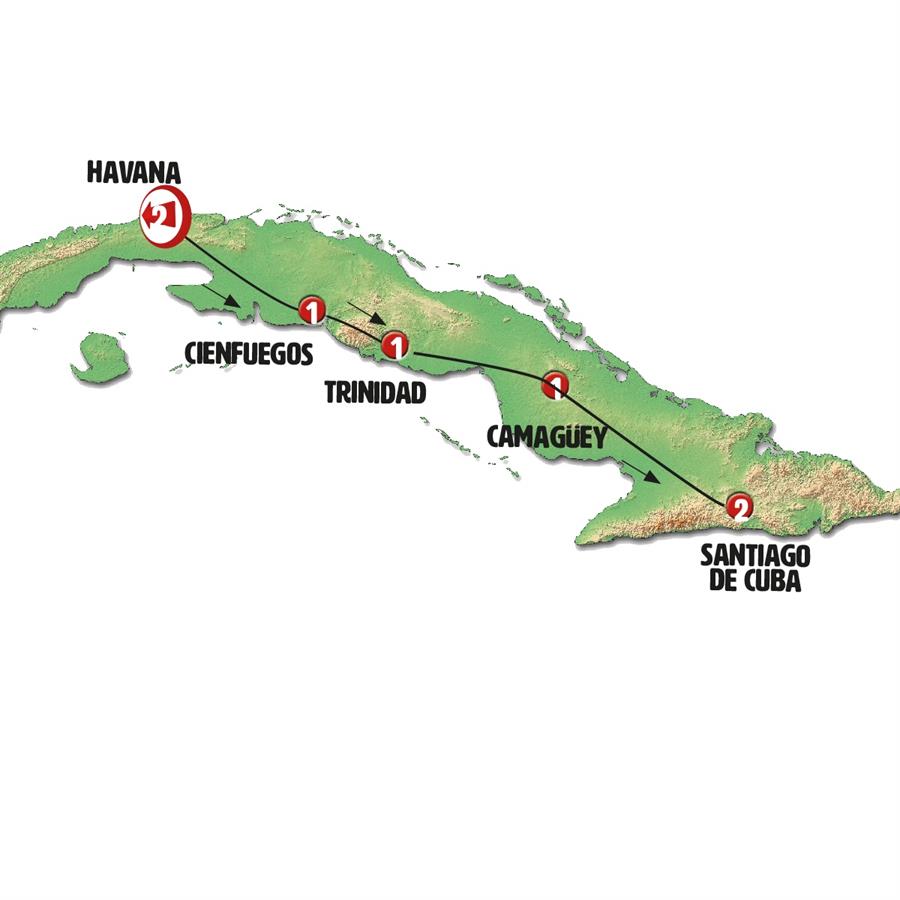 Havana, Guama, punta perdiz, giron, Cienfuegos, Trinidad, valle de los ingenios, Camaguey, guaimaro, Bayamo, Santiago de Cuba.