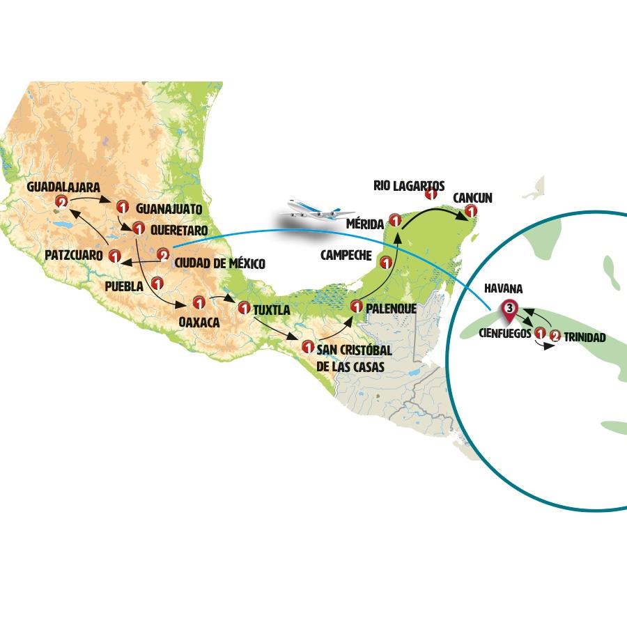 Havana, Guama, punta perdiz, giron, Cienfuegos, Trinidad, Cidade do México, mina de las dos estrellas, tlalpujahua, Pátzcuaro, Morelia, Tlaquepaque, Guadalajara, Guanajuato, Dolores Hidalgo, San Miguel de Allende, Queretaro, Tula, Puebla, Oaxaca, san pablo villa de mitla , Tuxtla Gutiérrez, Canon del Sumidero, chiapa del corzo, Zinacantan, San Juan Chamula, San Cristobal de Las Casas, Agua Azul, Misol Ha, Palenque, Campeche, merida mx, izamal, Chichen Itza, rio lagartos, cenote choj ha, Cancun.