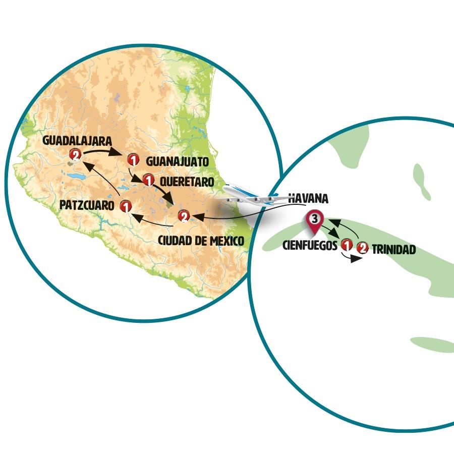 Havana, Guama, punta perdiz, giron, Cienfuegos, Trinidad, Cidade do México, mina de las dos estrellas, tlalpujahua, Pátzcuaro, Morelia, Tlaquepaque, Guadalajara, Guanajuato, Dolores Hidalgo, San Miguel de Allende, Queretaro, Tula, Puebla.
