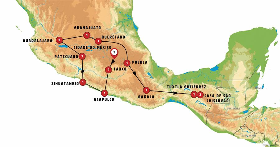 Cidade do México, tepoztlan, Cuernavaca, Taxco, Acapulco, Zihuatanejo, Janitzio, Pátzcuaro, Morelia, Tlaquepaque, Guadalajara, Guanajuato, Dolores Hidalgo, San Miguel de Allende, Queretaro, Tula, Puebla, Oaxaca, san pablo villa de mitla , Tuxtla Gutiérrez, Canon del Sumidero, chiapa del corzo, Zinacantan, San Juan Chamula, San Cristobal de Las Casas.