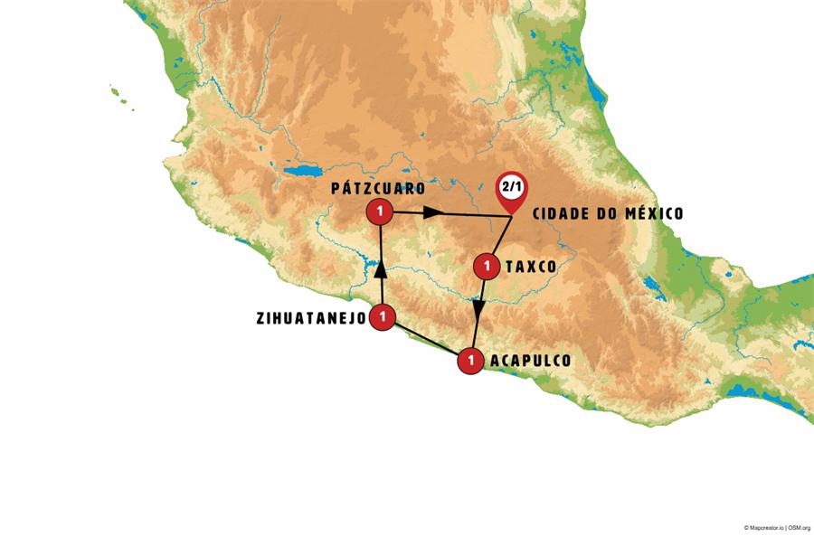 Cidade do México, tepoztlan, Cuernavaca, Taxco, Acapulco, Zihuatanejo, Janitzio, Pátzcuaro, Morelia, cuitzeo del porvenir.
