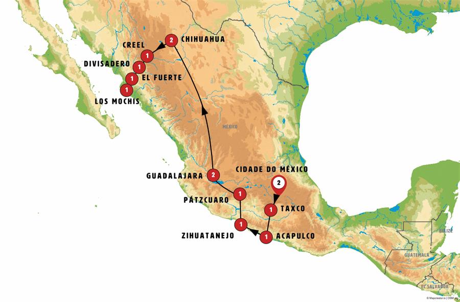 Cidade do México, tepoztlan, Cuernavaca, Taxco, Acapulco, Zihuatanejo, Janitzio, Pátzcuaro, Morelia, Tlaquepaque, Guadalajara, Chihuahua, Creel, Divisadero, chepe express, El Fuerte, Los Mochis.