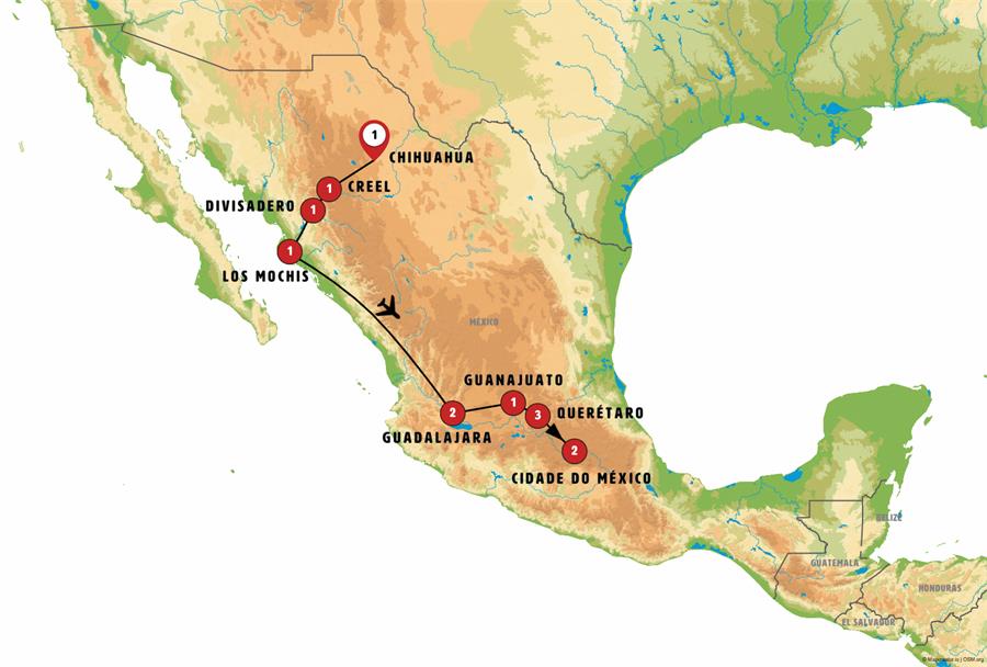 Chihuahua, Creel, Divisadero, chepe express, Los Mochis, Guadalajara, Guanajuato, Dolores Hidalgo, San Miguel de Allende, Queretaro, Cidade do México.